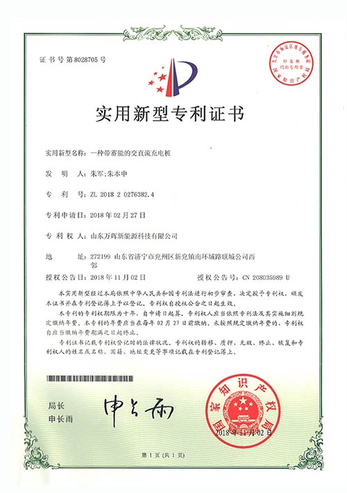 一種帶蓄能的交直流充電樁實用新型專利證書